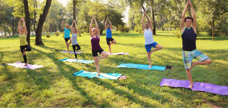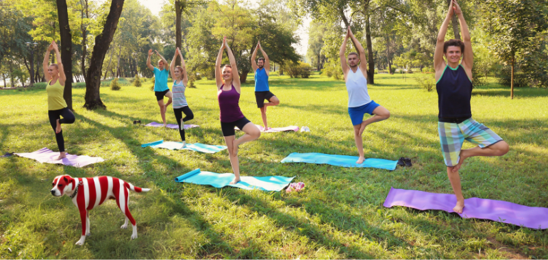 Bilder, Grafiken, Icons und Illustrationen gehören heute in der Kommunikation einfach dazu. In Canva kannst du eigene Bilder und Vorlagen sehr einfach bearbeiten, dabei sind die Möglichkeiten natürlich viel begrenzter als etwa in Photoshop, für den Alltag jedoch meist ausreichend. Im Anschluss an diesen Absatz siehst du drei Beispiele für eine Bildbearbeitung, die mit wenigen Klicks zu machen sind. Das Team von Daiichi einmal auf dem Originalbild und dann freigestellt. Darunter ein Bild im Original mit kleineren Kindern und dann die Version, in der die Kinder „ausradiert“ wurden, weil eure Bildrichtlinie vielleicht keine Kinder erlaubt. Und schließlich wurde als Hingucker der gestreifte Hund in ein Bild Yogakurs eingefügt. Im Upload-Bereich bleiben deine Dateien dauerhaft erhalten, du kannst sie also auch für weitere Gestaltungen nutzen. Ein großer Schritt in Richtung Nutzerfreundlichkeit war die Integration von zwei Bilddatenbanken mit 75 Millionen Bildern sowie Archive für Icons und Grafiken. Mit diesen Ressourcen ausgestattet brauchst du Canva während eines Projektes oft gar nicht zu verlassen, weil alles Nötige vorhanden ist. One stop shopping nennt man das in der digitalen Welt.