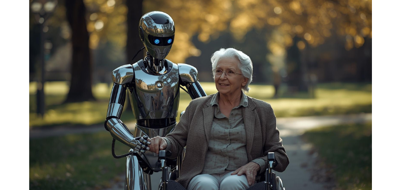 Ja natürlich, möchte man fast sagen, denn KI ist ja zurzeit überall angesagt. Laut Canva selbst ist schon heute in vielen Anwendungen KI integriert und es können Fotos, Videos, Audios und vieles mehr erstellt werden. Beim Testen erschien noch nicht alles davon überzeugend, allerdings erfolgen die Aktualisierungen teilweise im Wochentakt. Falls dich dieser Bereich interessiert, schau am besten immer wieder mal rein und bilde dir selbst eine Meinung. Und wie immer beim Thema KI gilt es auch hier, die gesetzlichen und ethischen Vorgaben zu respektieren. In der artifiziellen Bilderstellung ist mit dem einfachen Prompt, also der Befehlseingabe: „Ein humanoider Roboter schiebt eine ältere, europäische Frau im Rollstuhl“ folgendes Bild entstanden.