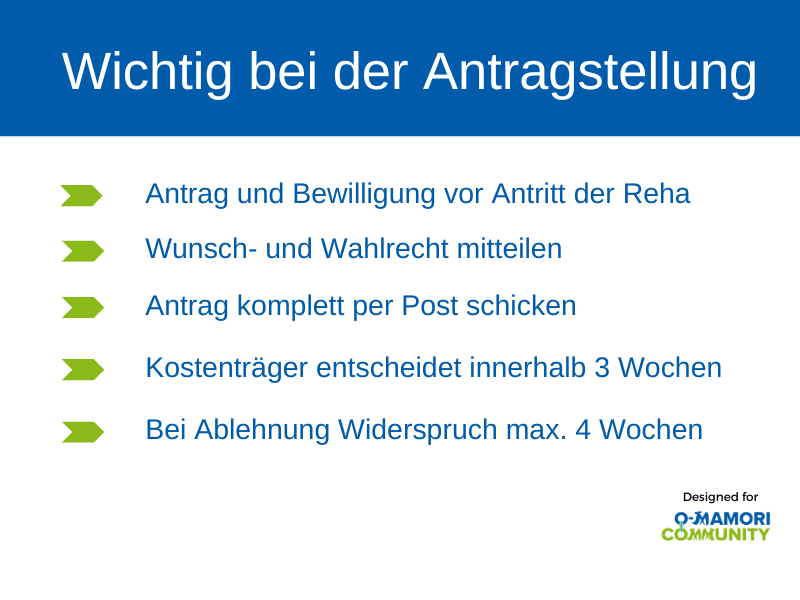 Das Wichtigste zuerst: Dein Antrag muss auf jeden Fall gestellt und bewilligt sein bevor du die Rehamaßnahme antrittst. Sonst besteht das Risiko, dass du die Kosten von mehreren tausend Euro selbst tragen musst, auch wenn du alle Anforderungen für eine Bewilligung erfüllst. Bei der Antragstellung unterscheiden wir zwei grundsätzliche Wege, direkt aus dem Krankenhaus oder von zu Hause aus. Vielleicht hast du selbst erlebt, dass während deines Aufenthaltes im Akutkrankenhaus der Sozialdienst der Klinik deine Verlegung am Ende des Krankenhausaufenthaltes zur weiteren Rehabilitation beantragt. Das nennt man die Anschlussrehabilitation. Der zweite Weg ist die Antragstellung von zu Hause aus aufgrund gesundheitlicher Beeinträchtigungen mit Unterstützung deines Hausarztes oder Facharztes. Wenn du im erwerbsfähigen Alter bist, erfolgt die Antragstellung für eine medizinische Reha bei der Rentenversicherung. Wenn du im Rentenalter bist, geht der Antrag an die Krankenkasse. Der Antrag muss schriftlich per Post eingereicht werden. Es ist sehr hilfreich, wenn du vorab klärst, welcher Kostenträger zuständig ist und alle Unterlagen auf einmal und vollständig einreichst. Ansonsten kann es zu unnötigen Verzögerungen kommen. Für die Antragstellung kannst du am besten die vorgefertigten Formulare für Antrag, Anlage und Selbsteinschätzung nutzen, die Vorlagen findest du direkt hier auf der sehr informativen Seite der Deutschen Rentenversicherung. Zusätzlich brauchst du den Befundbericht deiner Ärztin oder deines Arztes und am besten einen Arztbrief, in dem die Einschränkungen deiner Erkrankung möglichst genau beschrieben werden. Ebenso das Risiko der Verschlechterung, das ja mit einer Reha vermieden werden soll. Beim letzten Online-Meeting der O-Mamori Community hat Joachim Schmidt, Fachanwalt für Medizinrecht, ausdrücklich darauf hingewiesen, beim Antrag auf Reha unbedingt alle Befunde einzureichen. Sowohl mit medizinischem als auch psychischem Hintergrund. Mehr dazu findest du im Protokoll des Online-Meetings.