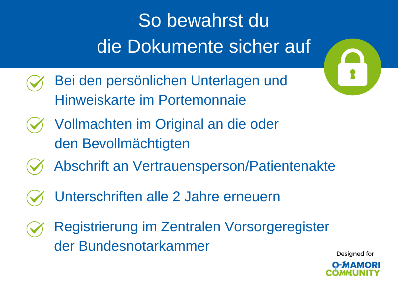 „Wenn die Dokumente erstellt und unterschrieben sind, dann sollten sie im Bedarfsfall auch auffindbar sind. Es ist wichtig, die Bevollmächtigten einzubinden und sie zu informieren. Sie müssen wissen, wo sie die Originale finden. Auch ein Notfallkärtchen in der Geldbörse mit einem Hinweis und Kontaktdaten kann hilfreich sein. Sinnvoll ist auch eine Eintragung im Zentralen Vorsorgeregister der Bundesnotarkammerunter https://www.vorsorgeregister.de. Dort wird nur registriert, dass es Vorsorgedokumente gibt und wer bevollmächtigt ist. Die Dokumente selbst werden dort nicht hochgeladen. Die Kosten für diese Eintragung liegen bei rund 25 Euro, das sollte uns eine gute Vorsorgeregelung auf jeden Fall wert sein.“