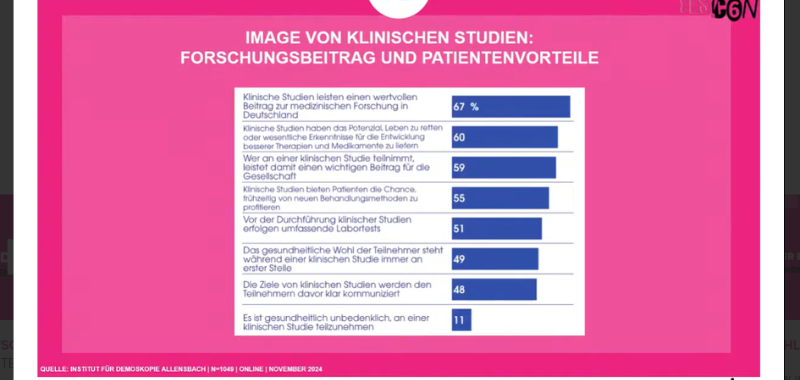 Während der YES!CON fand ein Panel statt, das sich eingehend mit den bestehenden Vorbehalten gegenüber klinischen Studien auseinandersetzte und die repräsentative Umfrage „5 Fakten zum Image von klinischen Studien in Deutschland“ der FUNKE Mediengruppe präsentierte. Erfreulich ist, dass 54 % der Befragten ungefähr wissen, was klinische Studien sind, und 40 % bereits von solchen Studien gehört haben. Lediglich 2 % gaben an, noch nie von klinischen Studien gehört zu haben. Auch das Image von klinischen Studien ist laut der Umfrage positiv in der öffentlichen Wahrnehmung verankert. So glauben 60 % der Befragten, dass klinische Studien das Potenzial haben, Leben zu retten, während 59 % der Ansicht sind, dass die Teilnahme an klinischen Studien einen wichtigen Beitrag zur Gesellschaft leistet.